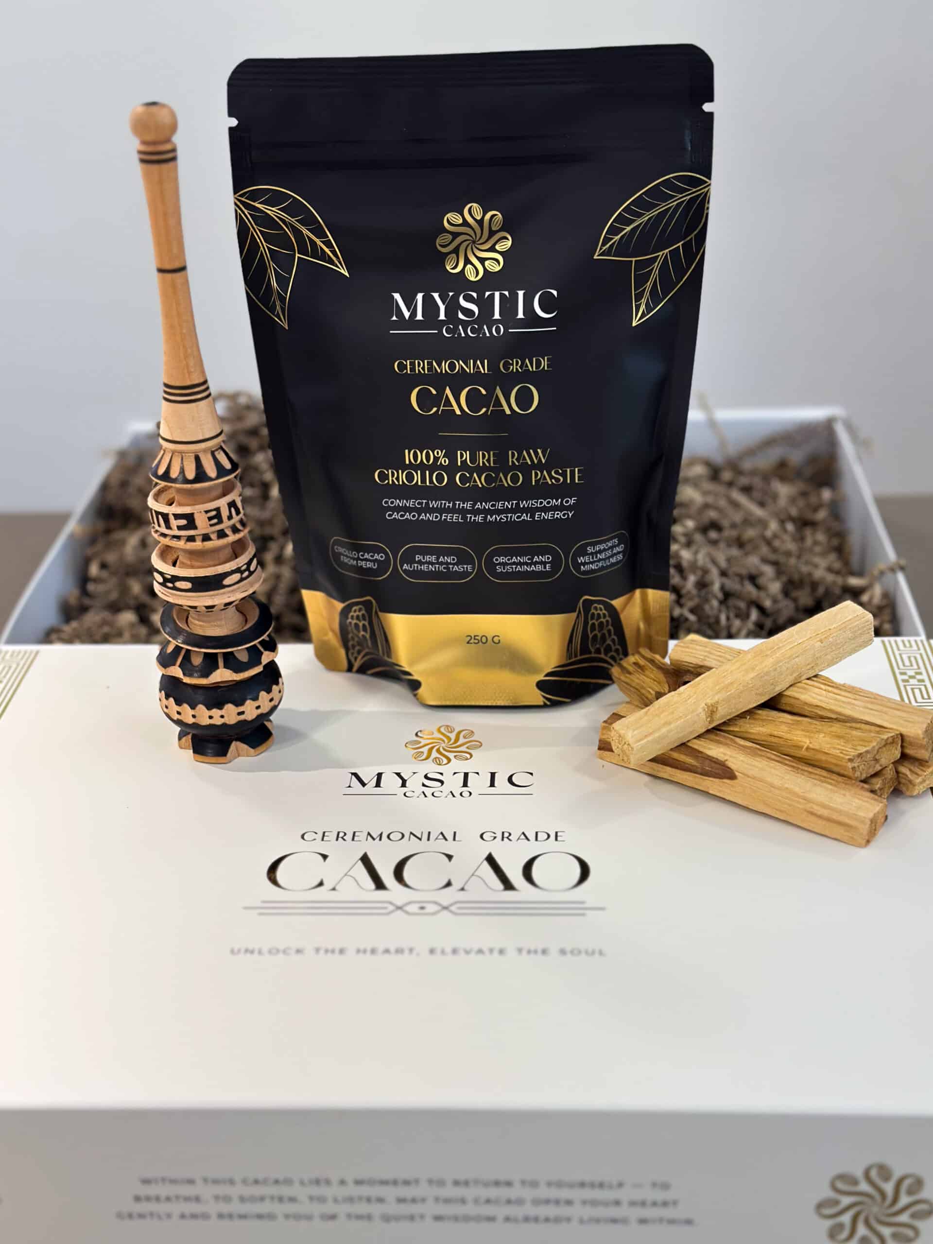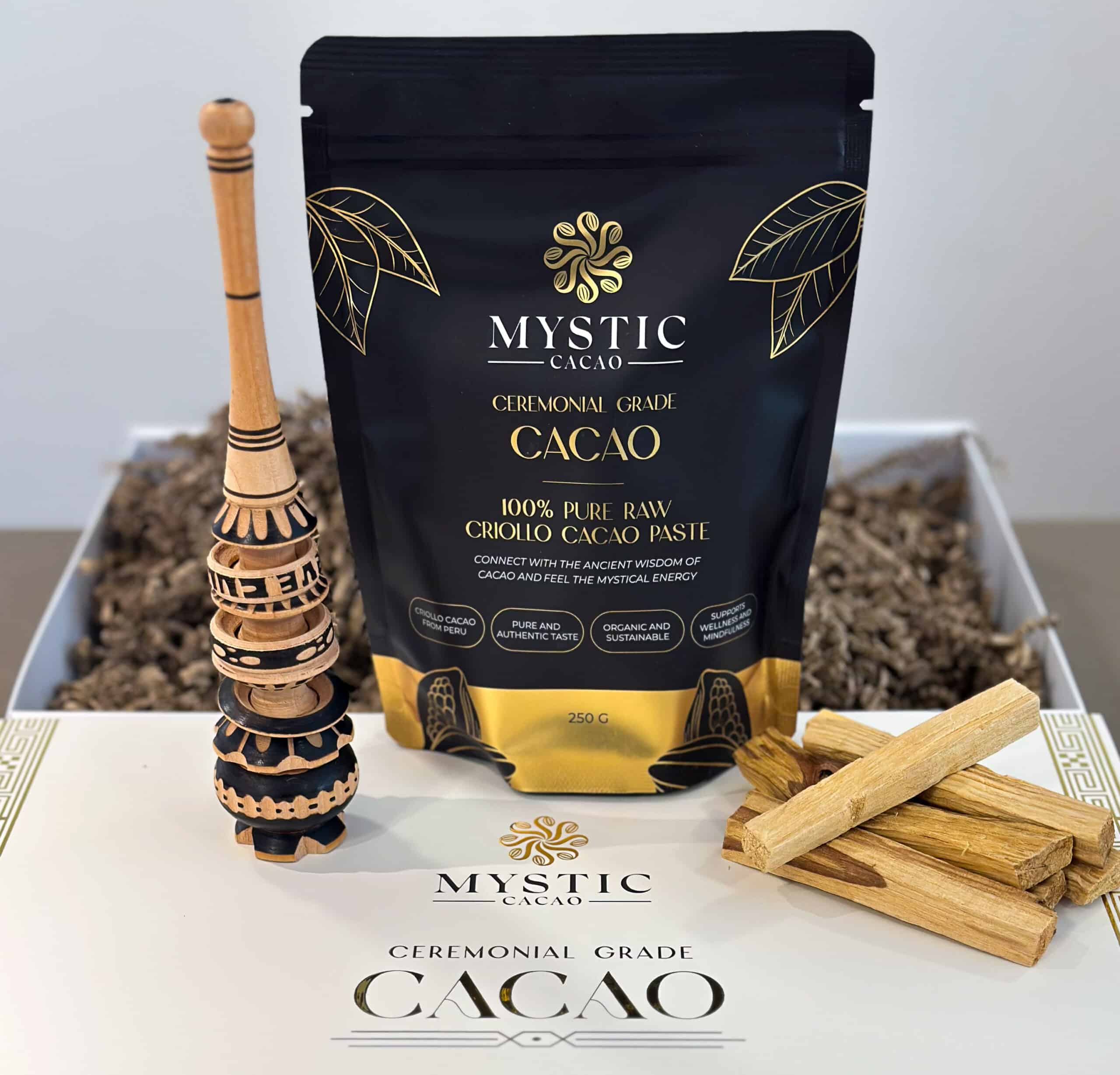 Cacao Ceremonie Starter Kit: Cacao, Molinillo en Palo Santo